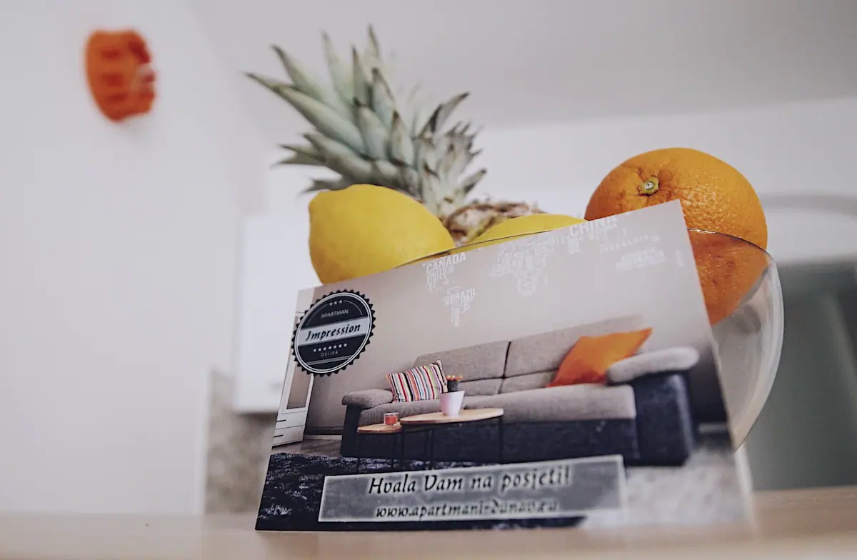 Predivno novo uređeni apartman u tihom centru Osijeka, kapacitet 1-2 osobe, samo 5 minuta udaljen od centra. 100m od glavnog željezničkog kolodvora Osijek. Apartman je renoviran, kuhinja, NOVA kupaonica, TV, KLIMA, WiFi, grijanje. Sve što Vam je potrebno za ugodan boravak u srcu Slavonije u apartmanu Impression Vam je na dohvat ruke. Moguć dogovor organiziranja posjeta Baranji. Na raspolaganju smo Vam.